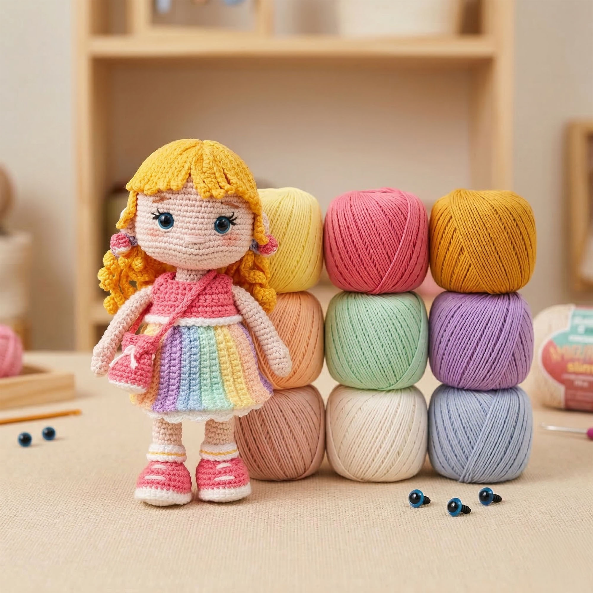 Tudo que você precisa para criar a Boneca Jubs do zero: 9 cores da linha Amigurumi Slim da Círculo, selecionadas a dedo pela DUAMÔ para o projeto. Combinação testada. Só chegar no encontro e criar.
